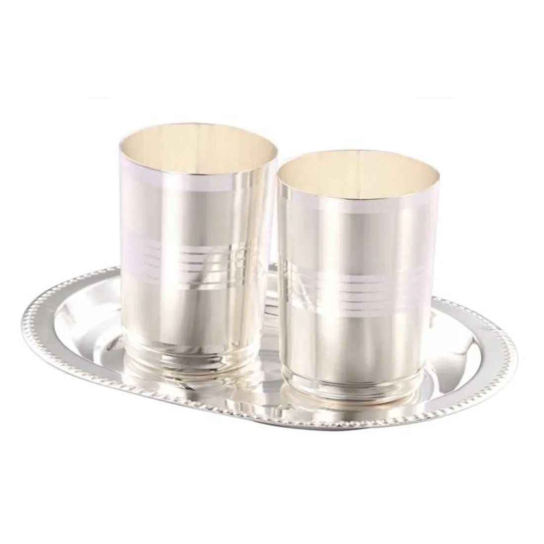 Pure Silver Plated Ditto Glass Set Material: Metal (silver Plated) MADE IN INDIA.Attractive Packing Box To Gift your loved ones and Perfect addition to your home decor.TRAY 21.5 X 17 CM / GLASS 9.5 X 17 CM, Weight 240 gm